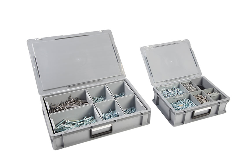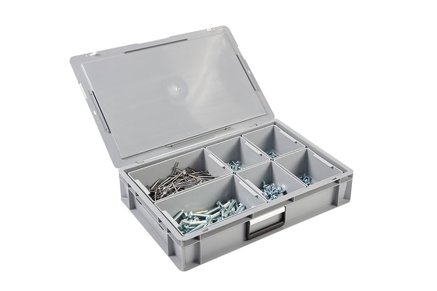 • Euronorm Koffer mit Verschlußdeckel, 2 Verschlussklemmen und ergonomischen Koffergriffversehen