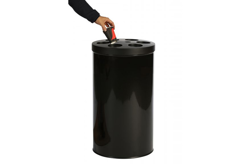 - Black metal, epoxy-coated; lids and tubes in durable black plastic