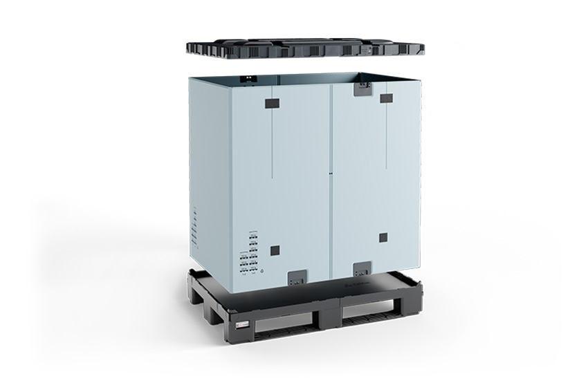• Collapsible container with Z-fold sleeve with lid and pallet on 3 runners