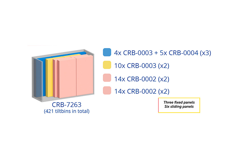- Integrated tilting tray modules per sliding panel: 14x CRB-0002 (x4) + 10x CRB-0003 (x2)
