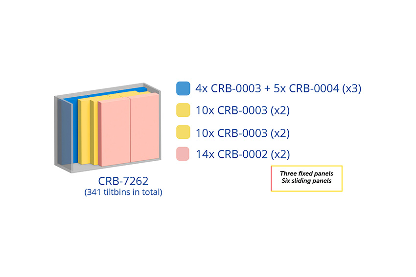 • Modules de bacs basculants intégrés par panneau coulissant : 14x CRB-0002 (x2) + 10x CRB-0003 (x4)