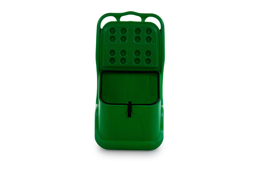 - Deksel kan verticaal gefixeerd worden voor bijvullen of ledigen