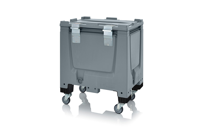 • Palletbox met 4 wielen onder de hoeken en scharnierend deksel in Euronorm formaat